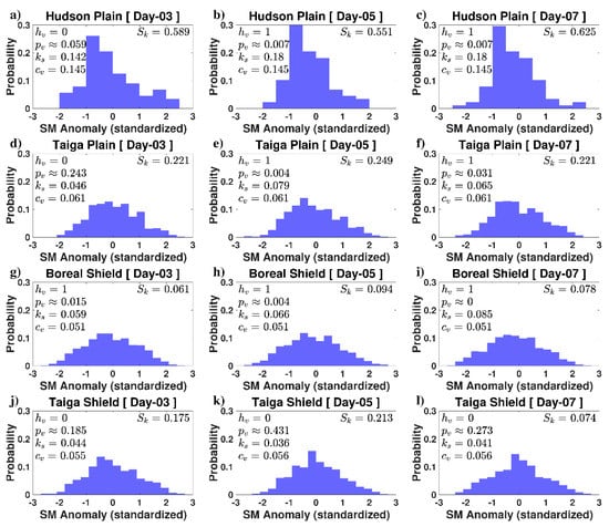 Distributions of fires with burned area greater than 200 ha. Soil moisture anomaly distributions at 3-days, 5-days, and 7-days (column-wise, left to right) prior to the occurrence of fire for ecozones Hudson Plain (a–c), Taiga Plain (d–f), Boreal Shield (g–i), and Taiga Shield (j–l), respectively. The parameters h, p, ks, and cv are MATLAB Kolmogorov-Smirnov (KS) test result parameters, as in Figure 4. The parameter Sk (top right) indicates the skewness of the distribution.