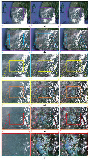 Illustration of the effect of level-of-detail (LOD) based enhancement. The standard Level-1C TCI product is zoomed from LOD 9 to 14 with the original LCE (left panel), LOD-based enhancement (Equation (1)) with a linear transition (Equation (2)) (central panel), and LOD-based enhancement (Equation (1)) with a power transition (Equation (3)) by setting n at a value of 0.5 (right panel). LOD = (a) 9, (b) 10, (c) 11, (d) 12, (e) 13, (f) 14. The region annotated in the colored box in each LOD is enlarged in the next LOD.