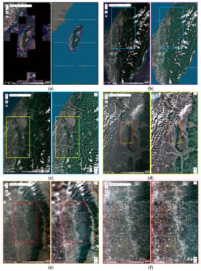 Example of Sentinel-2 imagery of Taiwan taken on 3 September 2018 (a) LOD = 7, (b) LOD = 9, (c) LOD = 10; and on January 11, 2020 (d) LOD = 11, (e) LOD = 13, (f) LOD = 14. The left panels are screen shots from Sentinel Explorer (https://sentinel2explorer.esri.com/; browsed on 16 January 2020). Taking the left panels as a reference, the right panels are the same region with the same LOD of the imagery processed by LOD-based enhancement (Equation (1)) with a linear transition (Equation (2)). The region annotated in the colored box in each LOD is enlarged in the next LOD.