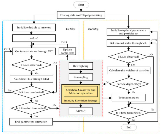 A complete DA framework contains three parts including model operator, assimilation algorithms, and observation data. In this section, a hydrological model and its parameters are briefly introduced. Then, a bridge is built between the model operator and satellite TB observation through a radiative transfer model. Next, DA algorithms based on Bayesian are described in detail for parameters and state variables estimation. Due to the emergence of some problems in both estimation processes, MCMC technology is introduced and used to mitigate the particle impoverishment. Then, the immune evolution strategy is proposed. In this paper, the main benefit of using an immune evolution strategy is to provide candidate particles with high quality and diversity for the MCMC move process. The DA scheme is also illustrated with a flowchart, which unifies the above mentioned independent parts into a whole. Finally, data assimilation experiments were designed to evaluate the DA framework.