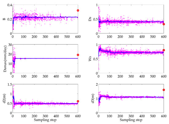 One of the experiments was selected to analyze the processes of parameters estimation. The particles tracking paths of the model parameters are illustrated in Figure 3 to help understand the convergence status of the immune evolution strategy. It is not difficult to see that in the initial stages, the magenta particles randomly distributed in the whole parameter space. The transitions of the sampling seemed to be efficient at exploring the solution space. With increasing iterations, all particles tended towards convergence with a limiting distribution that seemed relatively tight. Except for parameters of B and d3, the other estimates were close to the default parameter values, represented by the red circle at the right y-axis. This is perhaps to be expected, as the likelihood function of two estimation methods is calculated based on the different observations with TB or streamflow. The difference of optimal model parameters influences the SM simulation.