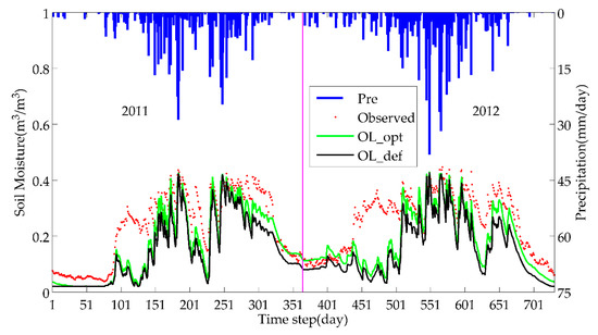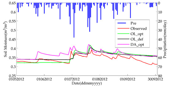 As the first step of the assimilation strategy, the preprocessed SMOS TBs were assimilated into VIC model to estimate parameters in 2011. Then, the parameters of the VIC model were updated by estimates. The simulated SM of OL was obtained by driving the model with the updated parameters in 2012. In addition, the available SMOS TBs were assimilated into the VIC with the same estimated parameters to estimate the SM in the same period. The different simulated SMs are analyzed and discussed with the model OL and in-situ measurements in the following section.