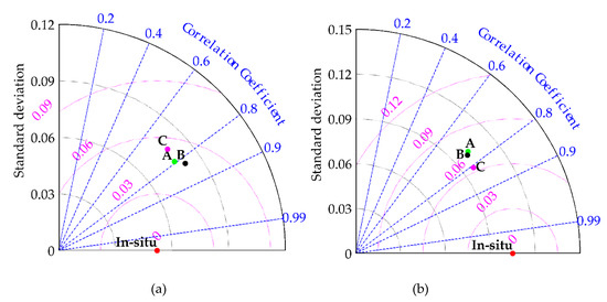 Figure 8 displays the statistics of the comparison of the estimated SMs and SMOS-IC products. Both SMOS-IC_ASC (D) and SMOS-IC_DES (E) had larger standard deviation and lower correlation coefficients than the model estimation. This larger standard deviation indicates that their variability was greater than that of the in-situ measurements. The same conclusion was also found by some other studies [55,61]. The correlation coefficients of the model simulated data sets were larger than 0.74, which implies a good ability of capturing the dynamic change of SM observations. The root mean square error difference (RMSD) of DA_opt was close to 0.06 m3m−3, which implies that there was not a significant bias in DA_opt. The results suggest that the estimated SM by assimilation was better than SMOS-IC in this region.