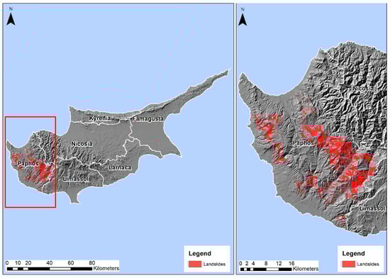 Landslide inventory map of Cyprus. Landslides occur mostly on the western part of the island. Digitized map based on data provided by the Cyprus Geological Survey Department.