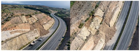 The landslide event under study occurred on 15 February 2019, following substantial rainfall, next to the Paphos—Limassol motorway A6, in the direction from Paphos to Limassol between exits of Avdimou and Pissouri (Figure 6). Extensive earthworks were carried out to remove the disturbed soil and the Paphos-Limassol motorway was again open to traffic on 23 March 2019.