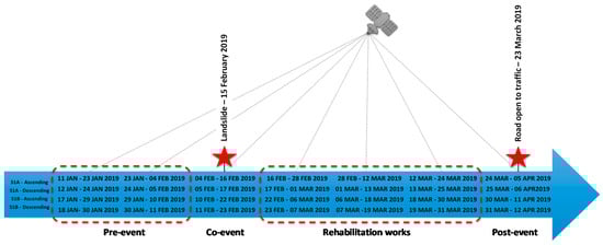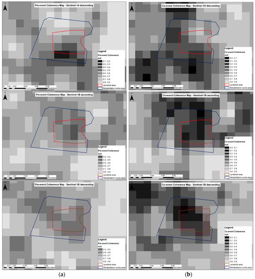 Lastly, the geolocated coherence maps were grouped in three individual stacks, i.e., pre-event, co-event, and post-event, as shown in Figure 9, for further comparison. The results from different pass directions of Sentinel-1A and Sentinel-1B were studied individually.