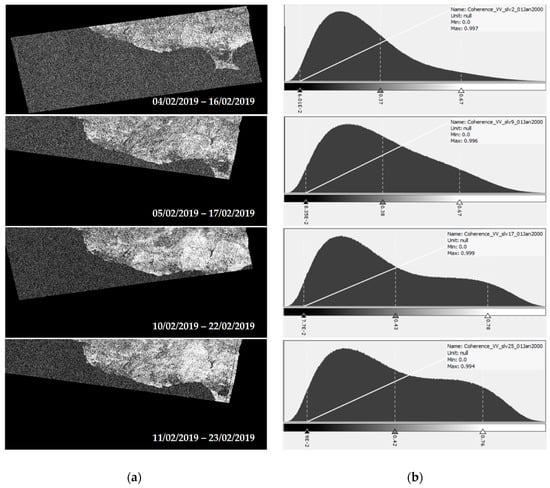 (a) Final co-event coherence maps and (b) their respective histograms. The coherence maps produced in SNAP show coherence values ranging from 0 to 1. The coherence maps dated 04/02/2019–16/02/2019 and 10/02/2019–22/02/2019 were developed from Sentinel-1A and 1B ascending images, respectively, whereas the ones dated 05/02/2019–17/02/2019 and 11/02/2019–23/02/2019 were developed from Sentinel-1A and 1B descending images, respectively. The histograms, with coherence on the x-axis and frequency of occurrence on the y-axis, show the frequency of coherence values in pixels at the entire scene.