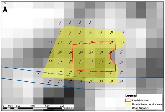 For the analysis of the data, a grid of 52 points (Figure 11) was created within ArcGIS, which covers the entire area where rehabilitation works took place (in yellow), starting one day after the landslide occurred, i.e., 16 February 2019, and finishing when the road was opened again to the traffic on 23 March 2019. From these 52 points, 20 points (pixels) lie within the boundaries of the area affected by the landslide (AOI).