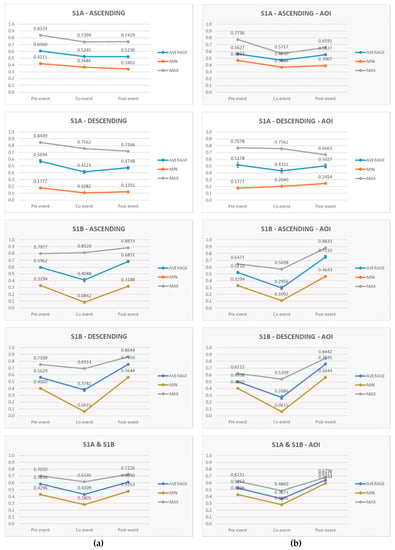 Coherence changes in the three periods for (a) the entire area and (b) the Area Of Interest (AOI). The minimum, maximum, and average coherence values obtained from Sentinel-1A and 1B ascending and descending based products as well as the overall average coherence values (min, max, and average) are presented during the pre-event, co-event, and post-event periods.