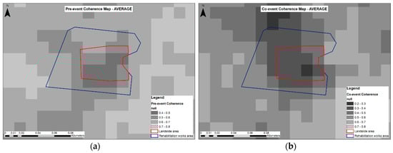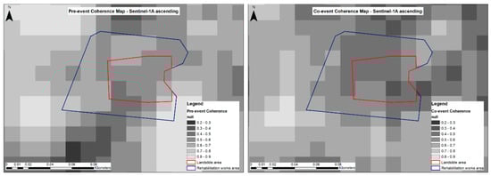 Within the determined landslide area, coherence loss and gain trends appeared to be strengthened, as presented in Figure 14. For Sentinel-1A ascending pairs, average coherence starts at 0.563 during the pre-event period and reaches 0.473 during the co-event period (−15.9%). Then, it increases by 16.9% and reaches 0.523 at the post-event period. In the case of Sentinel-1A descending, the situation is similar, as coherence decreased by 16.5% between the pre-event (0.518) and co-event periods (0.432) and then increased by 16.3% and reached 0.527. In both cases, the increase and decrease in coherence look symmetrical. As before, the minimum average values are not within the co-event period as values appear to decrease even more during the rehabilitation works.