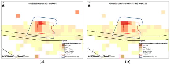 Significant changes of coherence must be identified in order to distinguish between a natural coherence decrease and a coherence decrease due to a natural disaster. A perfect relationship between two consecutive images is represented by a coherence value of 1. Thus, in areas where no significant change occurred, a coherence difference and a normalized difference should have zero values. This is never the case as natural decay takes place with coherence values decreasing over time. The distinction between the coherence loss due to the landslide under investigation and the natural coherence loss due to the temporal baseline of SAR images was further enhanced by calculating the expected natural reduction in coherence, as presented in Figure 17.