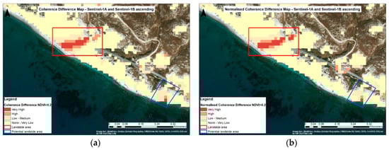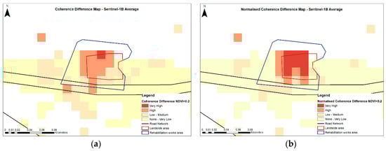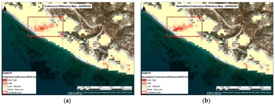 All results were thoroughly tested statistically using two-tailed t-tests and ANOVA tests. To remove the effect of vegetation from the phase decorrelation (coherence loss), the Normalized Difference Vegetation Index (NDVI) was calculated from Equation (3) within SNAP, based on Sentinel-2 satellite imagery, dated 3 February 2019. This was the closest to the landslides cloud-free and atmospherically corrected image (Level-2A). An NDVI mask was developed in Geographic Information System (GIS) environment and a threshold of 0.2 was used so that all areas with NDVI ≥ 0.2 were removed from further analysis. The application of this mask resulted in the calculation of coherence values, which were not affected by vegetation [70].