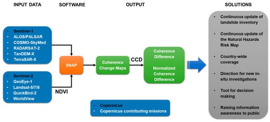 Additionally, CCD techniques, using the advantages of Sentinel-1 satellites and other contributing missions, can be used for the continuous monitoring of geo-hazards assisting in the update of natural hazard risk maps and geological suitability maps by detecting areas affected by natural hazards, such as landslides, with great accuracy. CCD methodology can provide valuable input for the extents of the affected area and can even detect landslides that occurred in remote areas and were not recorded before. It was the first time that such a technique has been successfully applied for landslides induced by heavy rainfall.