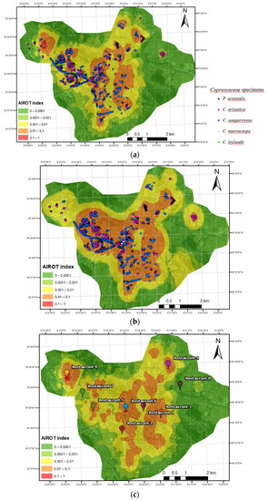 Including this parameter in the AIROT index will allow others in the future to create risk maps for cities in which the main species that cause allergy problems are implemented depending on the season of the year. It would be necessary to establish for each of these species an α value that estimates their phenological production. Then, according to the other parameters of the AIROT index, risk maps that serve as informative tools for the population could be created. The pollen production (α) and, therefore the phenology of the plants has not been included in the previous case of the plane trees [24] or in the Urban Green Areas Index (IUGZA) [23]. However, phenology and pollen production are very important factors to consider since the use of plants with high pollen production capacity could increase allergenicity [23]. This pollen production also influences aerobiological risk, and therefore AIROT, as shown in Figure 2a,b. In the first, the high-risk area coincides with specimens of C. macrocarpa, the species considered to have the highest pollen production in this and other studies [23,44]. However, for the second figure, the high risk area is located slightly in the western part of the city where there is the greatest accumulation of specimens, regardless of the species and the use in the form of a hedge, shrub or tree. Due to studies of pollen production [44] and observations made by the authors on specimens from cities, it is known that the species have different pollen production and that their pollen production is also reduced due to the effect of pruning [43], so it influences aerobiological risk. After this study, the AIROT will allow for the comparison of aerobiological risks between different cities, as was the case in the previous version, and the consideration of different species that coincide in their pollination period.