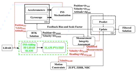 Flowchart of the inertial navigation system (INS)/ global navigation satellite system (GNSS)/3D light detection and ranging-simultaneous localization and mapping (LiDAR-SLAM) fusion design.