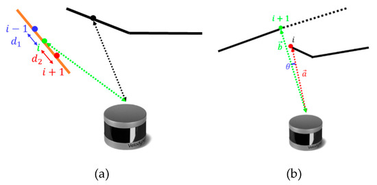To prevent the occurrence of such a situation, the first strategy for solving the first situation is to calculate the distances between consecutive points (, . LiDAR’s horizontal resolution is fixed. If the distances are higher than the threshold, it means the laser beam’s direction is somewhat parallel with the object edge line or object surface. The second strategy is to prevent the occluded situation. By calculating the vectors and distances between points and LiDAR’s center (), if the offset of two distances is larger than the threshold and the angle between two vectors is smaller than the threshold, they are considered as unreliable features.