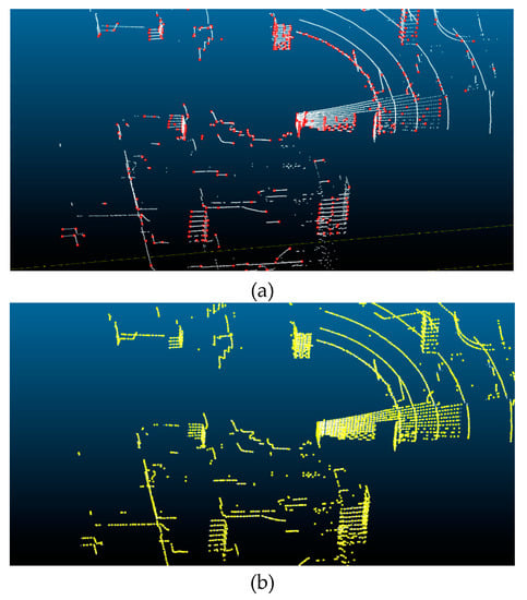 After the prevention of these two situations, the features extracted from the point can be evenly distributed and are more reliable for future LiDAR odometry use. Figure 3 illustrates the features extracted from the underground parking lot, where the red points (Figure 3a) represent the edge points and the yellow points in Figure 3b show the planar points. These edge features are located around the corner or the edge line of the objects, while the planar points are selected equally within the environment.