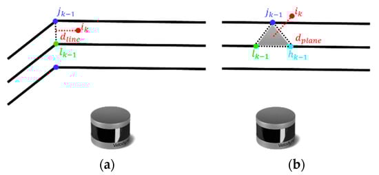 First, it is important to define the types of geometric relationships that are used in LiDAR odometry. In this paper, two geometries are used: edge line, as the correspondence for an edge point, and planar surface, as the correspondence for a planar point. Figure 4 represents the geometric relationship defined in 3D LiDAR-SLAM. In Figure 4a, the edge line is composed of two edge points ( and ) from the previous scan (), which are the closest to the current edge point () and must be selected in different channels. This is to prevent the selected edge line located on the same surface, which is parallel to the same scanning channels. The corresponding planar surface can be selected based on the three closest neighbors (, , and ) of the current planar feature (). Figure 4b clearly shows that the planar surface (gray triangle) is determined by three correspondences and at least two planar points in different channels.