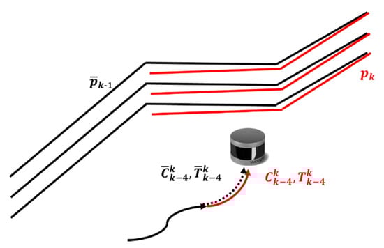 Based on the data processing shown in Figure 6, once the result from LiDAR odometry is detected as an unreliable solution, there are two strategies to address. As LiDAR odometry is a continuous process to align the features from the current scan with the previous scan, if the LiDAR odometry performs unstably, the first strategy is to replace the LiDAR odometry solution with the INS solution. Using a more stable INS solution prevents the outlier from influencing the updating process, which means that the edge and planar points are correctly transformed and stored for the next aligning. The second strategy in the odometry process benefits LiDAR mapping, as INS provides the initial value () for the mapping process instead of using an unreliable odometry solution. Since the mapping process is at the frequency of 4Hz, the INS-derived rotation and translation should cover the period from to . This strategy ensures that the mapping process has a relatively trustable initial value for conducting the LM algorithm [].