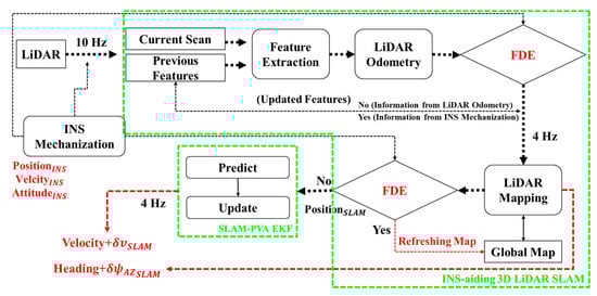 As discussed in the previous section, LiDAR odometry and mapping can run properly by themselves without any external source. However, this is under conditions where the environment is clear, without many moving objects, and the LiDAR platform is moving slowly. As this paper focuses on speedy automated vehicles and trying to enhance navigation performance, it is necessary to expand the system’s ability and make the overall LiDAR-SLAM more robust. Meanwhile, SLAM-derived measurements can also benefit the central fusion algorithm to provide more reliable and accurate navigation information. Figure 6 presents the detailed process of INS-aiding 3D LiDAR-SLAM (as shown in Figure 1, green box). As shown in Figure 6, this integration scheme first adopts fault detection exclusion (FDE) to eliminate the failure solution from LiDAR odometry through the INS solution. Similarly, FDE is also applied to validate the solution obtained from the LiDAR mapping process. If the final result from the mapping process is not stable or trustable, it will be excluded from the measurement update in SLAM-PVA EKF. Similarly, the refreshing process is utilized under this situation to refresh the map. Finally, SLAM-PVA EKF provides a smooth velocity instead of using a relatively position-derived velocity, as well as feeding the heading measurement from LiDAR mapping. In addition, this paper discusses the error model of the SLAM-derived measurement for the fusion filter. The details are provided as follows.