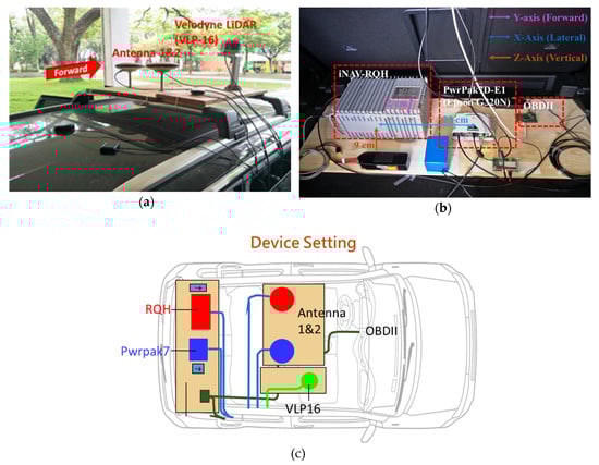 Configuration of the designed land vehicle: (a) GNSS antennas and LiDAR, (b) inertial measurement units (IMUs), (c) device setting.