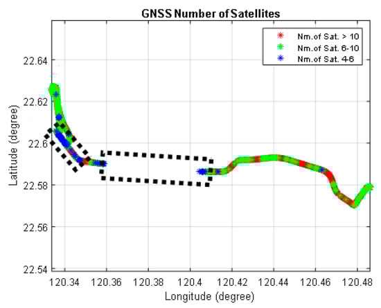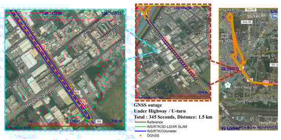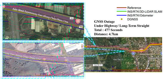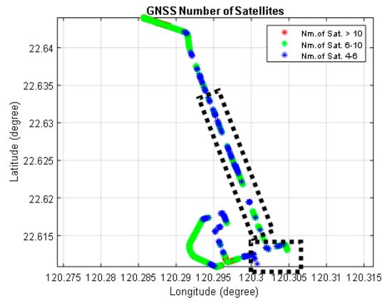 The second scenario is conducted along with the highway. There are several up-and-down paths to test the height performance and the long-term under-highway paths. Furthermore, the speed is maximally up to 100 km/h during driving on the highway, which tests the robustness and flexibility of the proposed integrated method. Figure 9 represents the overall differential GNSS solution with information from the number of satellites. Two block frames indicate the areas where the vehicle drives under the highway. The outage is up to 345 s with a 1.5 km traveled distance and 477 s with a 4.7 km traveled distance at a very high speed.