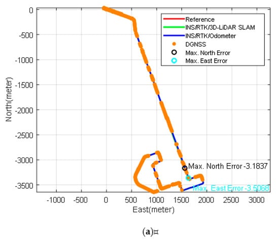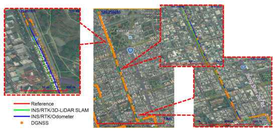 In the designed vehicle, there are two IMUs, iNAV-RQH and PwrPak7D-E1 (Epson G320N), as ground truth and a testing system, respectively. PwrPak7D-E1 is a commercial device from NovAtel, including a tactical-grade IMU (Epson G320N) and GNSS receiver. RQH is a navigation-grade IMU which can achieve a 30 cm accuracy combined with a differential GNSS and less than 0.1% error in distance travelled with odometer. Moreover, RQH can maintain a 5 mm/s accuracy in the velocity domain and a 0.01 degrees accuracy in heading with a differential GNSS []. In this paper, RQH is combined with the differential GNSS from PwrPak7D-E1 and velocity information from on-board diagnostics-II (OBDII) integrating through commercial software (Inertial Explore). The reference information is processed using the tightly coupled (TC) scheme with a forward-backward smoother. Therefore, it is a trustable reference system based on the specification of manufacturing. On the other hand, the testing system uses two integration methods with real-time kinematic (RTK), which is a real-time GNSS solution obtained from PwrPak7D-E1. To simulate the real-time solution, it is adopted in the integrated design instead of using a post-process differential GNSS solution. The first integrated design is a conventional design, INS/RTK/Odometer (PwrPak7D-E1/OBDII), and the other one is the proposed method, INS/RTK/LiDAR-SLAM (PwrPak7D-E1/VLP-16). The configuration of the designed vehicle is shown in Figure 7 and the specification of IMU is given in Table 1. The LiDAR used in this paper is VLP-16, which is deployed on the top of the vehicle (Figure 7a). For comparison, all the solutions are synchronized with GPS time and the relationships of each sensor are measured by the surveying tapes (Figure 7b,c). The following statistical tables were generated using this information to evaluate the performance of the proposed algorithm.