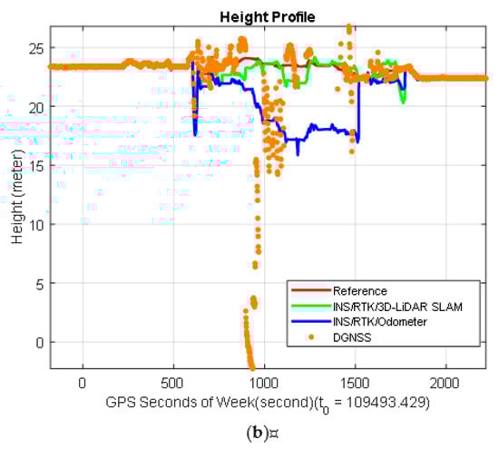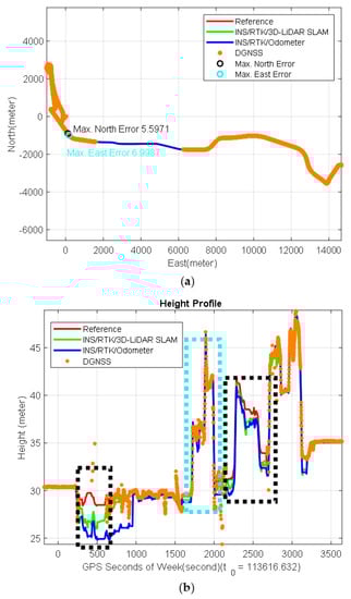 As shown in Figure 10, there are two figures—horizontal trajectory and height profile. The reference is plotted by the red line, the green line represents the integration result with the INS-aiding LiDAR-SLAM, the blue line indicates the trajectory from the conventional INS/GNSS/odometer, and the orange point shows the GNSS solutions. According to Figure 10a, the maximum errors in both north and east directions occur in the multipath interference or NLOS reception area, which are up to approximately 3.50 (black circle) and 3.18 (cyan circle) m, respectively. As seen from the height profile, the general height solution from GNSS is untestable in the GNSS-hostile area. However, we can clearly see improvement from Figure 10b. The height of the proposed method is much closer to the reference, with around 0.6 m in RMSE and 63% improvement, while the conventional positioning method is heavily influenced by the error-contaminated GNSS solutions, with around 10 m maximum error.