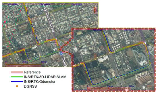 Figure 11 and Figure 12 show the zoomed GNSS-hostile and GNSS-denied in scenario 1 to concentrate on the performance of the proposed method. In Figure 11, the red blocks emphasize the error-contaminated GNSS. Clearly, the orange points deviate from the reference, even located 5–10 m away. In this situation, the conventional positioning method cannot avoid the wrong GNSS solution, as the accuracy index from the GNSS system is not correct. In other words, the GNSS system does not detect the impact of multipath interference or NLOS reception and still gives an unreliable solution. In contrast, the integrated design takes advantage of each measurement and conducts an integrity assessment to remove failure measurements, especially from GNSS. As a result, the possibility of taking failure measurement in the update process significantly reduces. Moreover, the stable velocity and heading measurements from the INS-aiding SLAM benefit the integrated system. In general, the integrated approach sticks closer to the reference, even when there are several GNSS outages, as shown in Figure 12. The INS/GNSS/odometer maintains a consistent performance. However, the accuracy degrades with the travel distance due to the error behavior of the odometer.