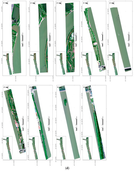 Shenzhen City is located in the southeast of Guandong province, China, and Maozhou River flows through the urban area of Shenzhen City, which is 41.61 km in length in total. As shown in Figure 1, the study area is located from 22°47′45″N to 22°48′15″N latitude and from 113°50′0″E to 113°51′0″E longitude, covering a 0.42 km2 area. The annual mean precipitation of Maozhou River is 1966.5 mm and precipitation gradually decreases from west to east. The annual mean temperature is 22.4 Celsius degrees. The water environment of Maozhou River is severely affected by the manufacturing factories along its banks, since these factories may dump some chemically perilous materials into the river. In particular, some textile or leather manufacturing factories dump the remains of their industrial waste into the river, causing the deterioration of the water in Maozhou River quickly and almost irreversibly within a short time period [23,24]. Maozhou River is adjacent to an estuary, such that countercurrents occur frequently, causing the aggregation and accumulation of living and industrial waste in the river [25]. The main types of land use and main activities along the river cover industrial factories, dwelling areas, parks, wetlands, wastewater discharge drainage and a water purifying factory (from west to east in Figure 1b). Moreover, this river is under the management of the local environmental protection department, who undertake inspections of its contamination. Efficient and economically friendly supervision from point to point in Maozhou River is critical. UAVs can work efficiently since the study area is relatively wide and open. The management and supervision of the Maozhou River can keep the local environmental protection department informed about its current state and the neighboring environment that might affect the quality of the water. The UAV flight area is the same area of study, since we can collect more densely distributed samples for model training and testing where researchers are able to find the distribution of the content level of water quality parameters and to trace the possible pollution resources.