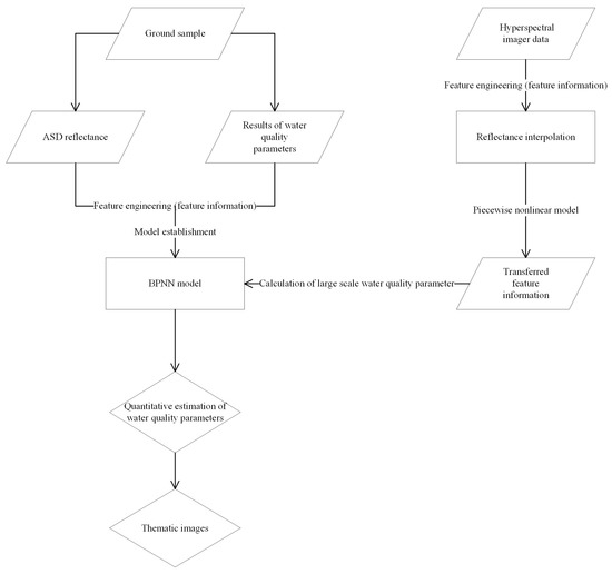 The proposed model mainly consists of three parts, a BPNN, a deep neural network (DNN), and a feature extractor. BPNN is improved from the traditional Bayesian neural network (BNN), which includes probabilistic analysis feedback, variational inference, backpropagation, Metropolis–Hasting sampling, and an asymptotic maximum likelihood estimator for balancing the distributional parameters. Figure 2 shows the workflow of the proposed method of hybrid BPNN to estimate the water quality parameters in a large area. Firstly, the ground sample is divided into two parts, ASD reflectance data and the results of water quality parameters, respectively, which work as the training dataset for establishment of the hybrid BPNN model. The feature extraction machine extracts the significant information for each water quality parameter from a mixed spectrum. Secondly, the extracted featuring information from the hyperspectral image data works as the input to refine the data by transferring UAV feature information obtained from Equation (2) to ASD-obtained feature information through the transferring model [27], such that the refined UAV data from Equation (3) can be used to calculate the results quantitatively in the proposed model. Finally, the package of ArcGIS was applied to generate thematic images. In the proposed method, there is no need to tune a large number of hyperparameters to the dataset, as this takes quite a lot time and is economically deficient. Additionally, we used the revised spectral reflectance of water, collected using a ground-based Analytical Spectral Device (ASD).