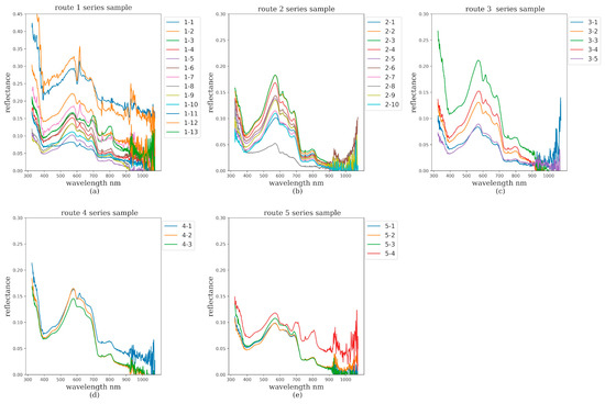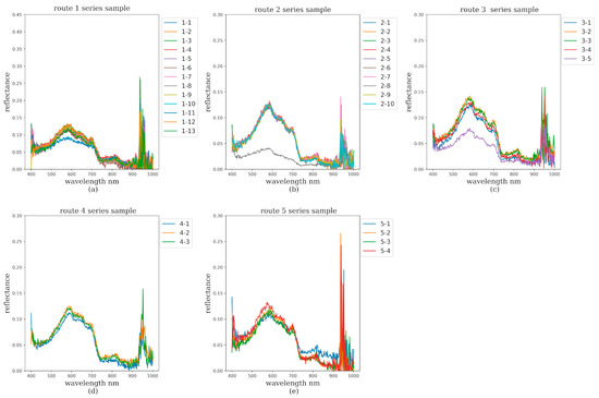 The reflectance values of UAV collected water samples along the same routes in Figure 1. UAV reflectance can be applied to establishment of transferring model as Equation (3). (a–e) represent the reflectance of samples at each wavelength from route 1–5 collected by UAV as described in Figure 1b.