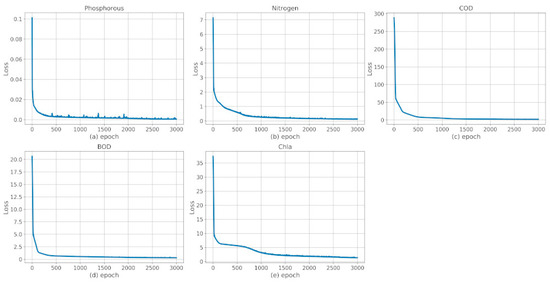 Figure 6 shows the training loss plot over epoch, where loss is defined as RMSE and the epoch is defined as an iteration number. The iterations required to train the proposed model is 3000. The loss of Figure 6a–d remains stable around 1000 training iterations and Figure 6e remains stable at 1500 training iterations. Possible explanations for the comparatively slow convergence of loss in Chla can be demonstrated from two perspectives. On the one hand, some water samples have same content levels of Chla corresponding to difference reflectance values, since the measuring precision of the experimental measuring apparatus is unable to distinguish a subtle difference less than one unit of μg/L. On the other hand, some possible noising bands, which currently cannot be detected, certainly affect the performance of the proposed model.