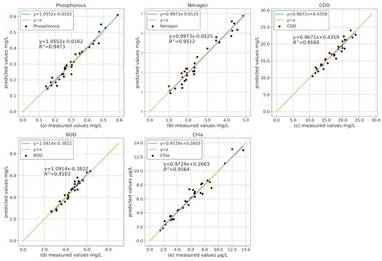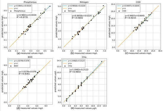 Figure 7 shows the predicted precision of each water quality parameter by comparing predicted values with measured values. The further off the blue line predicted values are, the lower the predicted precision of the proposed model is. The orange line is the regression line between predicted values and measured values. From the goodness-of-fit of the data, nitrogen and Chla obtain the best results. The RSMEs for Figure 7a,b are 0.03, 0.26, 3.15, 0.46, and 0.69, respectively. The MPAE for Figure 7a,b are 8.59%, 3.78%, 8.26%, 7.35%, and 5.43%, respectively.