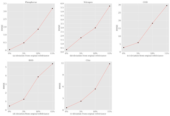 The water surface band reflectance might suffer uncertainty, which then results in more error in the estimation of water quality estimation. In order to illustrate such an effect, some levels of deviation in the band reflectance are added artificially into the original data. Figure 8 shows a comparison plot of predictions based on different percent deviations in the band reflectance from th perspective of RMSE, given by the proposed hybrid BPNN model. Furthermore, each graph shows that the prediction with 5% deviation from the band reflectance outperforms the others—namely predictions based on the reflectance of 10% and 15% deviations with respect to RMSE. The prediction with 15% deviation from the band reflectance results in the largest error compared to others in each plot. Figure 8 shows that there is a strong relationship between the band reflectance and the concentration of each water quality parameter [27]. It also demonstrates that the more the reflectance deviates from the original band reflectance, the precision explained by RMSE will be lower. Each water quality parameter is calculated using the hybrid BPNN method using the changes in the band reflectance.