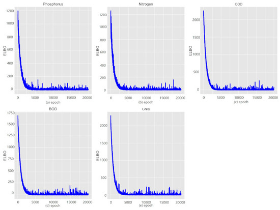 Negative evidence lower bound (ELBO) plots of each water quality parameter based on our hybrid BPNN model. (a–e) represent the negative ELBO values from hybrid BPNN model over 20,000 iterations for phosphorus, nitrogen, COD, BOD, and Chla, respectively.
