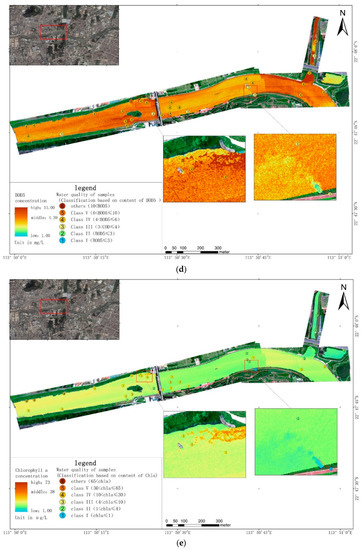 The ground ASD reflectance and numerical concentrations of water quality parameters were used as inputs for the proposed hybrid BPNN model to train the proposed model. UAV hyperspectral image data was transferred to ground ASD reflectance through Equations (2) and (3) in Section 3. Then, the transferred reflectance data from the UAV hyperspectral image can be transformed with eigenvectors, which can be used as inputs for the large-scale numerical prediction of water quality parameters. This study used UAV hyperspectral image data of the entire study area to calculate the concentration of each water quality parameter, as shown in Figure 11, which not only describes the distribution of the content levels of water quality parameters, but categorizes the pollution levels into six levels based on the content levels of each water quality parameter, respectively. Additionally, the criteria of categorization levels conform to the criteria of classification on water quality from our supporting program, Shenzhen Intelligent River pilot program. However, due to restrictions in terms of the UAV flying height and UAV battery imposed by the local government, our UAV had to fly along the river several times, and we had to combine all hyperspectral images to cover the whole study area. Thus, more UAV flights must be implemented to cover the entire study area, since a single flight under these limitations only covers a fraction of the entire study area. The method of data collection by UAV is flexible and effective for scanning reflectance of target object. Combining all UAV hyperspectral images results in combining traces between images in each plot since water is actively flowing, which causes the content level of each water quality parameter to change over time. In this study, UAV has to take several air strips one by one. Figure 11 delineates the resulting distribution of the concentration of water quality parameters at three wavelengths of 480, 550, and 670 nm for RGB color [27]. In Figure 11, the distribution of each water quality parameter can be observed through the change in the color of each plot, and thus local environment protection department can determine the source of pollution according to change in the content levels of each water quality parameter.