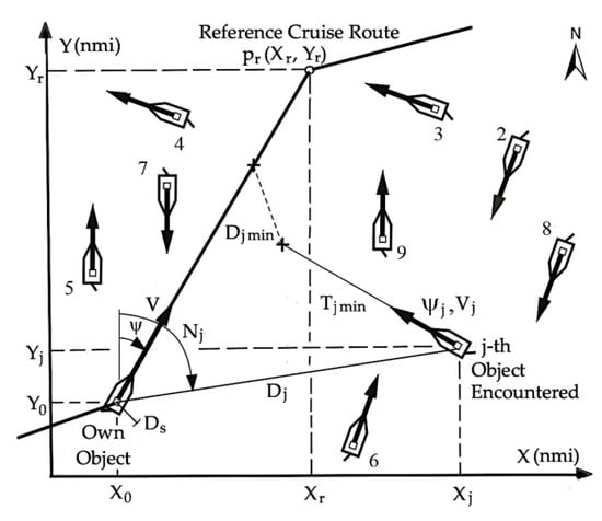 Own object, moving course ψ at speed V, is equipped with an ARPA device, performs radar remote sensing of the encountered j-th object, moving course ψj at speed Vj, at distance Dj and bearing Nj (Figure 1).