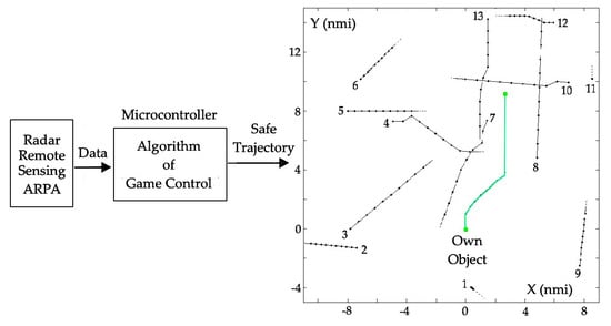 The purpose of this review is to refer the considerations to the last method mentioned above through a detailed comparative analysis of the methods of game object control in collision situations with many objects passing by using radar remote sensing. The main premise for these considerations is that the navigator’s subjectivity in assessing the navigational situation, taking into account the rules of the sea law COLREGs, as well as the possibility of making a mistake and contributing to a collision situation as a conflict situation, has a great impact here. Game theory, which is a chapter of modern mathematics, including the theory of accidental events and the construction and analysis of their models, comes to the rescue. The conflict may be military, political, social, or economic, where there is a game with nature and there is the application of object steering, that is, when they interact, the impact disturbances or other objects can be seen. Therefore, it is appropriate to treat the process of passing objects safely as a game control, taking into account the cooperation or lack of cooperation between objects. The problem of collision-free sea control strategies has already appeared in Isaacs [], the creator of differential game theory, and has been developed by many authors, especially object control in conditions of uncertainty. According to the authors [,,], determining anti-collision strategies is easy, except for the uncertainty of the data, the results from harsh weather, high sea levels, as well as the actions of other objects and the navigator’s subjectivity in maneuvering decisions and imprecise character recommendations of international collision regulations COLREGs. Dockner et al. and Baba et al. [,] stated that the topic of defining safe strategies is still valid, due to the constantly increasing vessel traffic in individual water bodies; on the one hand, increasing the requirements of safe navigation and the safety of the environment; on the other, increasing the operational capacity of computer-assisted navigators. According to Breton et al. and Sanchez-Soriano [,], the largest type of game relates to the motion control of objects, including autonomous and non-autonomous marine objects, which are differential games.
