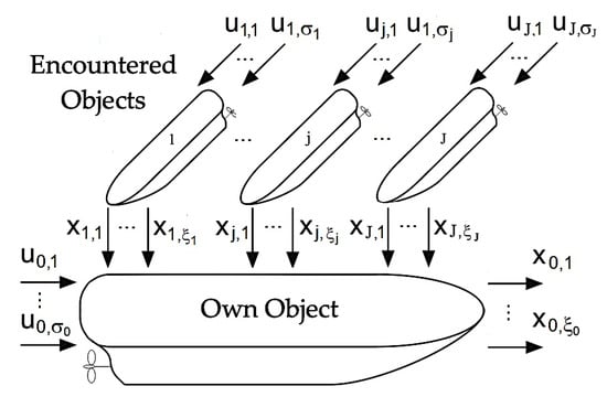 Interaction of the movement of own object and multiple passing objects: u0, x0—control and state of the own object; and uj, xj—control and state of the j-th object.