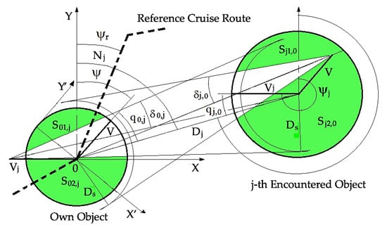 Acceptable game control of the own object u0 and uj of the j-th encountered object includes the kinematics of their movement, recommendations of COLREGs sea route rules described in [,] and condition (4)—maintaining a safe passing distance Ds—to create sets of acceptable game positional strategies, i.e., U0,j and Uj,0: