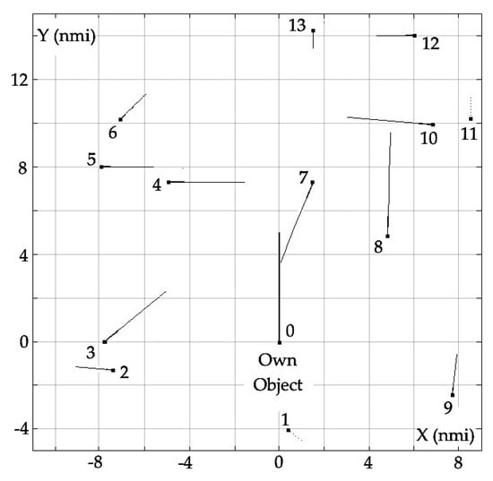 The mgnc and mgc algorithms have been subjected to simulation tests in SIMULINK software in situation examples of own objects passing 13 other objects whose data from the radar remote sensing ARPA system is listed in Table 2. Simulation studies that reflected the movement of objects, both in good visibility at sea for Ds = 0.5 nmi (nautical miles) and in limited visibility at sea at Ds = 2.0 nmi (nautical miles), are shown in Figure 10 and Figure 11. Additionally, it should be clarified that, in the drawings, the trajectories of the objects encountered do not change due to the difficulty of presenting them based on complicated operations while determining the optimal element of risk matrix R and/or the probability matrix P.