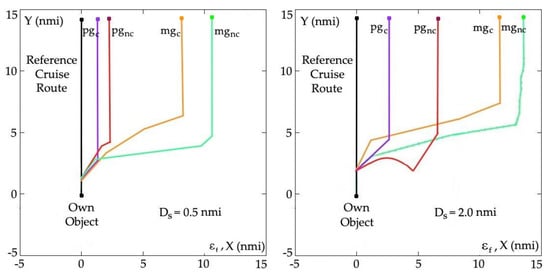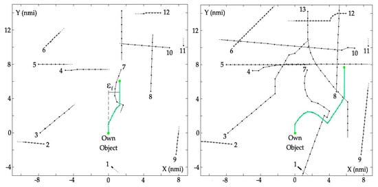 Object game trajectories calculated according to the mgnc algorithm of non-cooperative matrix game control: on the left—with good visibility at sea, with the final payoff of the game εf = 9.2 nmi achieved, assessing deviation safe trajectory from reference cruise route; on the right—with limited visibility at sea, with the final payoff of the game εf = 13.8 nmi.