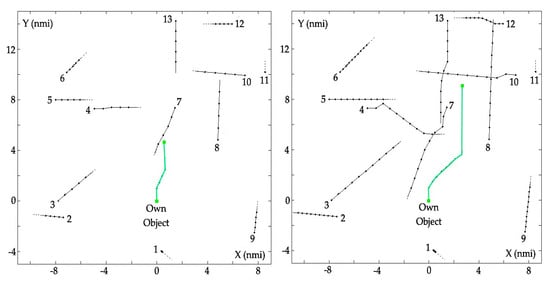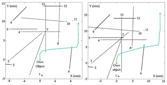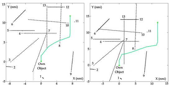 Object game trajectories calculated according to the mgc algorithm of cooperative matrix game control: on the left—with good visibility at sea, with the final payoff of the game εf = 7.4 nmi achieved, assessing deviation safe trajectory from reference cruise route; on the right—with limited visibility at sea, with the final payoff of the game εf = 12.1 nmi.