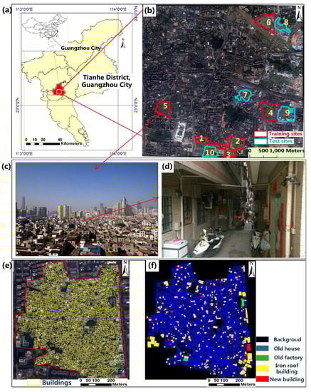 (a) Location of the study area in Tianhe District of Guangzhou City; (b) WorldView-2 image with red and blue polygons marked as training and test sites, respectively; (c,d) on-site view of one selected site; (e) vector file of the building boundaries; and (f) labeled image with building categories.