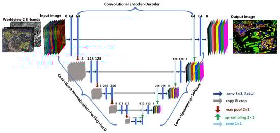 In this study, semantic segmentation was developed based on U-net architecture [33]. It is noteworthy that an encoder-decoder architecture becomes increasingly popular in semantic segmentation due to its high flexibility and performance [28,30,34]. According to Ronneberger et al. [33], the U-net architecture uses the following types of layers and special operations: (1) Conv2D, Simple convolution layers with padding and 3 × 3 kernel; (2) MaxPooling2D, Simple max-pooling layers with 2 × 2 kernel; (3) A cropping 2D, cropping layer used to crop feature maps and concatenate; (4) A concatenate layer used to concatenate multiple feature maps from different stages of training; (5) An UpSampling2D layer used to increase the size of the feature map. Then, the decoder part is implemented for up-sampling; and (6) Finally, a softmax layer is added to generate a final segmentation map. The structures of the encoder and decoder parts are symmetrical with skip connections between them, which proves to be effective to produce fine-grained segmentation results. More importantly, U-net can preserve the feature maps to the same size as the original image, where up-sampling layers are followed by several Conv layers to produce dense features with finer resolutions. This study modified the deep-learning architecture to handle the Worldview image with eight bands. The modified deep learning architecture can accept any size of images ranging from megabyte to gigabyte. The advantage of the modified U-net is an “end-to-end” procedure; for instance, segmentation. For high-density building segmentation using images, the modified method can assign a class to every pixel according to which class exactly belongs to the intricate.