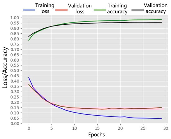 Training loss and accuracy against 30 epochs: training loss (blue); validation loss (red); training accuracy (green); validation accuracy (black).
