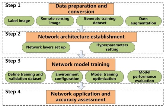 The U-net architecture as well as the whole semantic segmentation procedure were mainly implemented based on the Tensorflow and Keras deep learning framework in Python programming language. All other processing and analyses were carried out using open-source modules, including GDAL, NumPy, Pandas, OpenCV, Scikit-learn, etc. The deep learning network experimentation and modeling were executed in Jupyter Notebook programming platform. The configuration of the computer environment was Ubuntu 16.04.4 operation system with the virtual machine configured with 16 GB of RAM and an NVIDIA Geforce GTX 1080 GPU. The complete procedure of the deep-learning for semantic segmentation using the U-net was summarized in Figure 4.