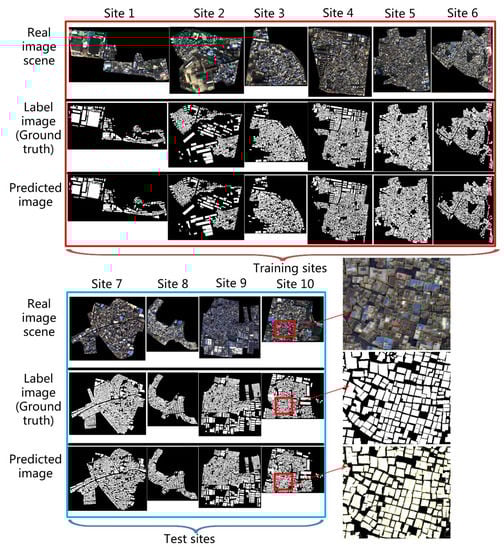 The results of building segmentation were presented in Figure 5, including the six training sites and four test sites within the red box and blue box, respectively. The predicted images in the training sites and test sites showed a good match with the label image (ground truth). For each high-density urban village with overcrowded, irregular-shaped buildings, the network model precisely delineated individual buildings. As presented in Figure 5, the data set used for training should get good prediction results; on the other hand, the test sites that also obtained good predicted maps visually looked like the label images. A snapshot of a magnified area also gave an in-depth inspection of the segmentation results; more importantly, it is shown that the boundaries of the adjacent buildings were correctly separated. Individual buildings are seldom missing, and boundary shapes are basically delineated and preserved.