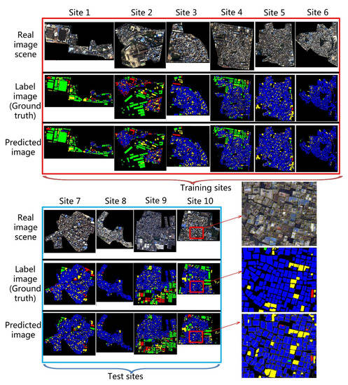 On the other hand, the classifications of the test sites 7, 9, and 10 gave relatively lower values of F1-score, mainly because some newly-built buildings (red in Figure 6) were incorrectly identified. In fact, it is hard to discriminate between the new and old buildings with the naked eye, and the network model learned such features insufficiently, which led to misclassification. The quality of the satellite image also matters. The highly irregular-shaped and great unbalance of the buildings among the samples used for the model training might also have led to problematic results. Last but not least, the labeled reference data and the satellite image should have a strict alignment in spatial registration. Therefore, the researchers should be cautious regarding data quality.